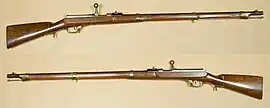 - Nach konsequenter Weiterentwicklung seit 1827 wurde es 1839 der preußischen Armee zur Erprobung gegeben und zur Tarnung als „leichtes Perkussionsgewehr M/41“ eingeführt" – de:Zündnadelgewehr