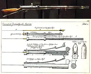 As primeiras armas com "ignição por agulha" eram de antecarga, mas o avanço veio com os de retrocarga, desenvolvidos por volta de 1832 por Johann Nikolaus von Dreyse.[1]