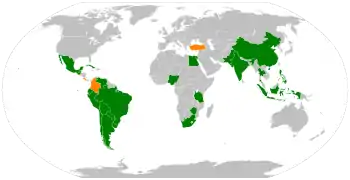O G20, inicialmente, começou com vinte e um países.[1] Atualmente, possui uma vasta e equilibrada representação geográfica, sendo integrado por vinte e três membros permanentes: cinco da África (África do Sul, Egito, Nigéria, Tanzânia e Zimbabwe), seis da Ásia (China, Filipinas, Índia, Indonésia, Paquistão e Tailândia) e doze da América Latina (Argentina, Bolívia, Brasil, Chile, Cuba, Equador, Guatemala, México, Paraguai, Peru, Uruguai e Venezuela).[7] Quatro são as nações não permanentes, sendo três no continente americano (Colômbia, Costa Rica e El Salvador) e uma na Europa (a Turquia).