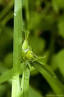 Seu corpo adulto é resistente, afiada para o anterior e posterior (fusiforme), pouco tem vestígios de asas (são braquípteros). Da cor verde-oliva brilhante com manchas pretas em todo o corpo. O macho é visivelmente magro (0,8 centímetros em seu ponto mais largo) do sexo feminino (até 1,5 cm). Os olhos são preeminentes, a cabeça é triangular, mais largo que longo, as antenas são mais alongados do que no masculino e composto por 14 juntas. Vive entre as plantas e preferem se alimentar de girassol selvagem (Helianthus annuus L.), que usa tanto as folhas,ramos e pétalas.