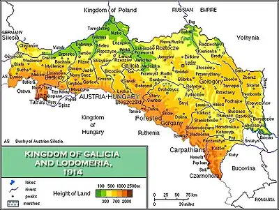 A Galícia (em ucraniano e rusin Галичина [Halyčyna]; em polonês/polaco: Galicja; em checo e em eslovaco: Halič; em alemão: Galizien; em húngaro: Galícia/Kaliz/Gácsország/Halics; em romeno: Galiția/Halici; em russo: Галиция [Galitsiya]; em iídiche: גאַליציע [Galitsiye]) é uma região histórico-geográfica da Europa centro-oriental.[1][2][3] Foi parte do Império Austríaco (de 1864 a 1918 denominado Império Austro-Húngaro) e seu território é dividido atualmente entre a Polônia e a Ucrânia. A área, que foi denominada a partir da cidade medieval de Halych[4][5] foi mencionada pela primeira vez em crônicas medievais húngaras do ano de 1206 como Galiciæ.[6][7] Em 1253, o príncipe Daniel da Galícia foi coroado rei do Rus (em latim: Rex Rusiae) ou rei da Rutênia após a invasão mongol da Rússia (Rússia de Quieve). Em 1352 o Reino da Galícia-Volínia foi anexado pelo Reino da Polônia como voivodia da Rutênia (em latim: Palatinatus Russiae).