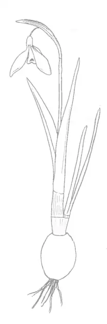 Galanthus nivalis cresce para cerca de 7-15 cm de altura, florescendo entre janeiro e abril na zona temperada do norte (janeiro-maio na natureza).[6] São plantas herbáceas perenes que crescem a partir de bulbos. Cada bulbo geralmente produz duas folhas lineares, ou muito estreitamente lanceoladas, verde-acinzentadas e um escapo ereto e sem folhas (caule florido), que carrega no topo um par de válvulas de espátula semelhantes a brácteas unidas por uma membrana semelhante a papel. Entre elas emerge uma flor branca solitária, pendente, em forma de sino, sustentada por um pedicelo delgado.