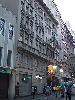 Seus cinco pisos, mais um entre-solo, se estruturam em três blocos principais: O embasamento, constituído pelo térreo mais entre-solo, com imitação de pedras aparelhadas como revestimento; um segundo bloco com 3 pisos com aberturas retangulares com sacadas com gradis e fechadas com venezianas, que se distingue do térreo por uma balaustrada contínua a servir de parapeito para o primeiro pavimento, e por fim o derradeiro piso, com uma série de janelas de arco pleno separadas por coluninhas jônicas. O arremate é uma bela cornija também jônica. O portal é ladeado por duas grandes colunas de granito róseo, acima do qual existe um pórtico com quatro colunas de mesma ordem, também de pedra.