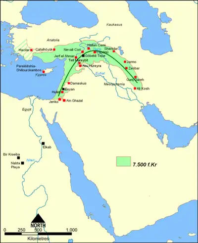 O lugar foi habitado pela primeira vez por volta de 10000 a.C.. O sítio tem cinco níveis arqueológicos. Porém, datas obtidas pelo método de carbono 14 fornecem uma antiguidade de 8700 +- 150 anos. Esta datação dá-lhe um papel de primazia entre os pioneiros na adoção do neolítico, a um nível semelhante ao de Zawi Chemi e Shanidar.