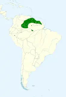 Pode ser encontrada nos seguintes países: Brasil, Colômbia, Guiana Francesa, Guiana, Peru, Suriname e Venezuela.[1]