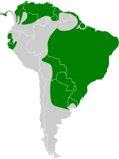 Presente em quase todo o Brasil, com exceção de áreas densamente florestadas. Encontrado também do Panamá à Argentina.