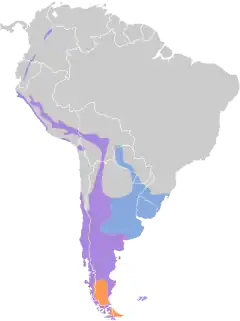 Associada a vegetação arbustiva e herbácea, a espécie ocupa áreas de pântanos, chacos, estepes, alagadiços e campos. Ocorre na Argentina, Chile, Colômbia, Bolívia, Equador, Peru, Paraguai e Uruguai. Distribui-se ao longo da Cordilheiras dos Andes, em menor abundância na Colômbia e Equador, e pode ser avistada desde o nível do mar até 4 500 m de altitude. No Brasil se limita à região Sul, aos estados do Rio Grande do Sul, Santa Catarina e Paraná, sendo parte migratória regionalmente e parte residente.[3][10] [11]