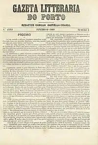 Gazeta Literária do Porto também conhecida por “Gazeta de Camilo Castelo Branco”, publicou-se semanalmente na capital nortenha em 1868, com início em Janeiro, e contou com a presença de Camilo como redator principal assinando a grande maioria dos textos publicados. Este facto originou um litígio entre o escritor e o editor da “Gazeta”, Anselmo Evaristo de Morais Sarmento, reclamando, o primeiro, o pagamento do seu trabalho, reclamando, o segundo, a propriedade dos textos, de tal forma que acabou por conduzir ao encerramento da publicação. Quanto aos conteúdos, estes alternavam entre os folhetins, romances, crónicas, críticas etc., assinados por personalidades relevantes da literatura portuguesa, entre os quais: Ana Plácido (que assinava sob o pseudónimo de Gastão Vidal de Negreiros), Tomás Ribeiro, Delfim de Almeida, Bulhão Pato, Ramalho Ortigão, Ernestina da Luz, Frederico Laranjo, José Maria d’Andrade Ferreira, Pinheiro Chagas, António Feliciano de Castilho, Júlio de Castilho e António Azevedo Castelo Branco (sobrinho de Camilo Castelo Branco).[1]