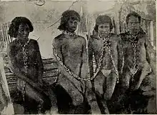 Os aleutas foram sujeitos ao genocídio e à escravidão pelos russos durante os primeiros 20 anos de governo russo, com mulheres e crianças aleutas capturadas pelos russos e homens aleutas massacrados.[66]