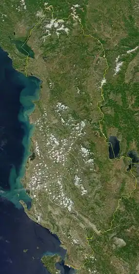 A Geografia da Albânia é caracterizada principalmente por um relevo montanhoso. Esse é um país de beleza natural diversificada, marcado por uma geografia única que combina uma costa espetacular com cadeias montanhosas impressionantes.[1] Essa localização privilegiada entre o Mar Adriático e os Bálcãs contribui para a rica herança cultural e paisagística do país.[2] A maior montanha (2753 metros) é a Korab. Na planície costeira, o clima é temperado com verões frios e secos e no inverno, muito calor. Nas partes mais altas, muitas vezes, ocorrem mais de 2.000 milímetros de chuva e neva anualmente.[3]