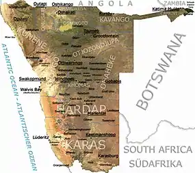 A Namíbia é um país predominantemente desértico; ali podemos encontrar os desertos de Caoco e Namibe, junto à costa, e o Calaári numa parte do seu interior.[1]