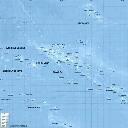 As ilhas da Polinésia Francesa somam um total de 4167 km² - dos quais 3265 km² correspondem a ilhas habitadas - e encontram-se dispersas sobre 2,5 milhões de km² de oceano. Ao todo, a Polinésia Francesa é composta por 118 ilhas, de origem vulcânica ou coralina, repartidas em cinco arquipélagos: