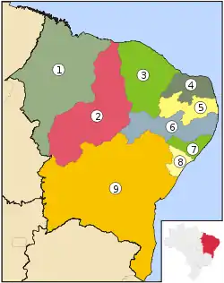 1 • Maranhão, 2 • Piauí, 3 • Ceará, 4 • Rio Grande do Norte, 5 • Paraíba, 6 • Pernambuco, 7 • Alagoas, 8 • Sergipe e 9 • Bahia