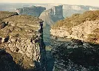 A formação do acidente geográfico deve-se a dois processos tectônicos: o primeiro, de soerguimento e abatimento que data de cerca de 1,2 bilhão de anos e duração de 700 milhões de anos, onde a bacia existente foi preenchida por sedimentos que formaram as rochas características; o segundo processo data de 600 milhões de anos, com a formação das montanhas num processo de orogênese chamado de Ciclo Brasiliano, com basculamento e falhamento que, junto a outros fatores externos, originou as atuais formações do relevo sedimentar: planaltos, chapadas tabulares, cuestas, etc.[5]