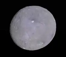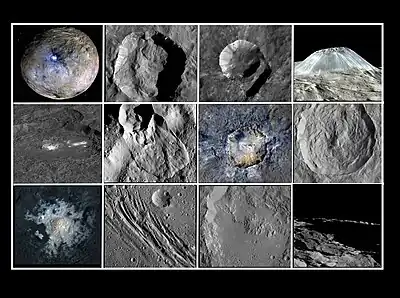 Várias características brilhantes da superfície foram descobertas no planeta anão Ceres pela sonda Dawn em 2015.[12] O ponto mais brilhante está localizado no meio da cratera Occator e é chamado de "ponto brilhante 5". 130 áreas brilhantes foram descobertas em Ceres, que se acredita serem argilas ricas em sal ou amônia.[13]