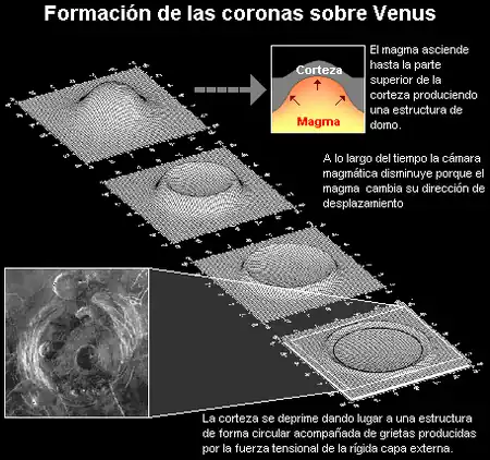Outras das características extraordinárias do planeta que por sua aparência se chamam coronae (coroas em latim) e outras figuras conhecidas como aracnoides por sua semelhança às teias de aranha. Também se encontram grandes rios de lava, evidência de erosão eólica e um tectonismo importante que em conjunto fazem da superfície de Vênus uma das mais complexas (Figura 3).