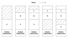 Partições fixas e Partições variáveis: As principais diferenças são o tamanho e a localização das partições que variam conforme os processos entram e saem da memória nas partições variáveis, enquanto que nas partições fixas os parâmetros são fixos. Nas trocas de processos quando deixam muitos espaços vazios na memória, há a possibilidade aglutiná-los em único espaço contíguo de memória, movendo-os o máximo possível para os endereços mais baixos. Técnica denominada compactação de memória. No entanto não é muito utilizada pelo tempo de processamento necessário considerado alto. Algo que deve ser dado uma devida importância é a quantidade de memória que deve ser alocada a um processo, quando for criado ou trazido do disco para memória. Se o processo possuir tamanho fixo, inalterável, então o processo de alocação torna-se simples: o sistema operacional alocará o espaço necessário. No entanto, na área de dados que o processo puder crescer, é alocado uma área temporária denominada (heap). Se houver espaço disponível ao processo, ele poderá ser alocado a esse determinado processo. Quando os processos puderem ter duas área de expansão, a área de dados sendo usada como área temporária (heap) para variáveis dinamicamente alocadas e liberadas, e uma área de pilha para variáveis locais e para endereços de retorno.