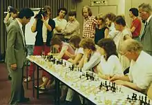 Garry Kasparov em 1985 em Hamburgo jogando simultaneamente com as quatro filhas de Gerhard Hund Susanne, Barbara, Isabel e Dorothee, com sua mulher Juliane de pé na direita.