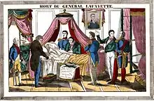 Lafayette morreu no dia 20 de Maio de 1834, na rua d'Anjou-Saint-Honoré em Paris (actual rua d'Anjou no 8º arrondissement de Paris). Foi sepultado ao lado da sua esposa no Cemitério de Picpus[148] em terra trazida de Bunker Hill.[145][149] O rei Louis-Philippe deu instruções para realizar um funeral militar para evitar a presença do público. A multidão juntou-se para protestar a sua exclusão do funeral de Lafayette.[134]