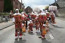 Eles também usam tamancos de madeira e tem campainhas ligados aos seus cintos.[2] Na parte da manhã, eles usam uma máscara com um design específico. Depois de chegar à câmara municipal, eles removem estas máscaras — eles não são usados no período da tarde. Durante a tarde, o desfile, eles jogam laranjas sanguíneas a multidão, e alguns dos Gilles usam grandes brancos chapéis emplumados. Eles carregam ramons, amarrados nos cachos de galhos, e cestas para levar as laranjas.[1]