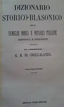 Sua obra mais celebrada é o Dizionario storico-blasonico delle famiglie nobili e notabili italiane estinte e fiorenti, em três volumes, editado em Pisa entre 1886 e 1890, com uma grande compilação de dados sobre famílias nobres e patrícias vivas e extintas da Itália, que embora contenha muitas falhas de impressão e omissões importantes, em sua amplitude não teve paralelos anteriores e continua sem concorrentes modernos. Os critérios que estabeleceu para esta pesquisa foram a base da metodologia adotada pelo órgão oficial de heráldica e genealogia do Reino da Itália unificada, a Consulta Araldica, com a importante colaboração de seu filho Goffredo, destacado pesquisador em seu próprio direito. O Dizionario lhe trouxe fama continental e lhe valeu condecorações e o convite para ingressar em várias academias.[1]