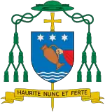 D'azzurro, com uma tez coberta de vermelho, segurando uma ânfora de terracota de camada única, colocada em uma faixa; acompanhada na cabeça por três estrelas de seis pontas ordenadas em uma faixa e na ponta por três explosões onduladas, todas prateadas | O lema "Haurite nunc et ferte" significa "tirai e levai" e é a exortação que Jesus fez aos servos, em referência ao milagre da água transformada em vinho, durante o casamento em Caná descrito no Evangelho de João. O braço direito no escudo indica o ato de puxar e derramar água, representado na parte inferior pelas linhas prateadas, balançando. É o símbolo do ministério episcopal que se baseia nos dons da graça celestial e os distribui aos fiéis. |
