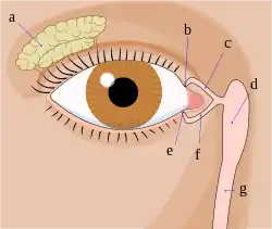 ![]() Sistema lacrimal a = glândula lacrimal b = ponto lacrimal superior c = canal lacrimal superior d = saco lacrimal e = ponto lacrimal inferior f = canal lacrimal inferior g = canal lacrimal | |