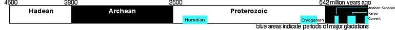 Linha do tempo das glaciações terrestres, em azul. A Karro é a penúltima