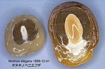 Gleba de Phallus impudicus, à esquerda, ainda circundado pelo seu perídio, à direita em corte, sem o perídio, na periferia, uma massa gelatinosa translúcida, depois em escuro, a futura gleba e, na centro, o futuro estipe.
