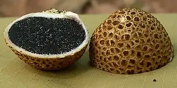 As the spores mature, the sporogenous cells often liquify and/or disintegrate, leaving just the spores behind as a powdery mass that can easily blow away... In other cases, the gleba may be sticky, as in Sphaerobolus stellatus; or it may be enclosed in a case (called a peridiole), as in the Nidulariaceae.