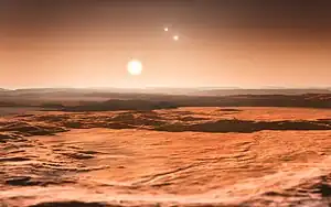 Impressão artística de Gliese 667 Cb, com Gliese 667 A e B ao fundo.