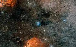 Imagem do céu em torno de Gliese 667. Gliese 667 A e B formam o ponto brilhante do centro da imagem. Com tela cheia, Gliese 667 C pode ser vista como um ponto logo abaixo de Gliese 667 AB. As nebulosas NGC 6357 e NGC 6334 são visíveis no topo à esquerda e embaixo da imagem respectivamente.