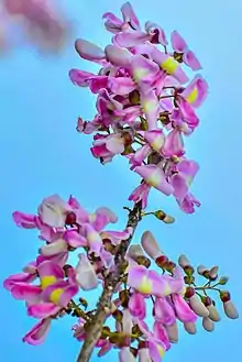 As flores estão localizadas na extremidade dos ramos que não possuem folhas. Estas flores têm uma cor rosa brilhante a lilás tingido de branco. Uma pálida mancha amarela é geralmente visivel na base da flor.