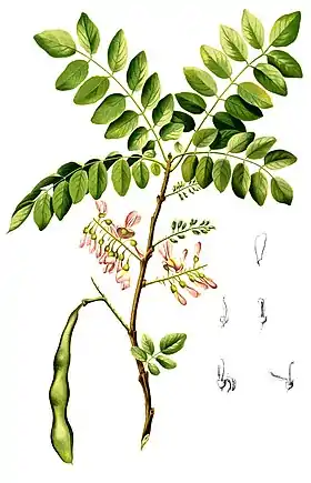 O fruto da árvore é uma vagem de cerca de 10-15 cm, de cor verde quando imatura e amarelo-acastanhado quando atinge a maturidade. A vagem produz quatro a dez sementes redondas de cor castanha. Suas sementes são dispersas até 40 metros de distância, após a abertura "explosiva" das vagens, com uma taxa de germinação em torno de 90%. Por isso é considerada uma espécie invasora em algumas regiões.[4]