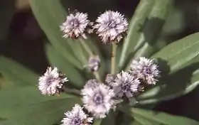 Esta planta apresenta flores de corola azulada a esbranquiçada, dispostas em capítulos axilares, com cerca de 1 centímetro de diâmetro.