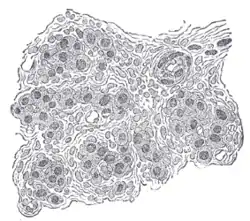 ![]() Seção de parte do corpo carotídeo humano. Altamente ampliado. Numerosos vasos sanguíneos são vistos na seção entre as células. | |