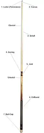 O pau de bilhar ou taco é o instrumento alongado de madeira ou material sintético, com um dos lados afilado, com o qual os jogadores tocam as bolas para tratar fazer carambolas ou embolsar essas bolas, dependendo do jogo. Os tacos de melhor qualidade costumam ser desmontáveis em 2, 3 ou mesmo 4 peças. São compostos por várias partes: a empunhadura ou parte inferior, lastrada para ter maior peso, a flecha ou metade superior, mais ligeira, e a virola que une a flecha com a suela. As medidas do taco habitualmente rondam os 140-145 cm, e a ponta entre os 10-15 mm, dependendo do jogo.