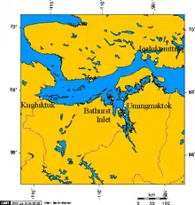 Administrativamente, suas águas e costas pertencem ao território de Nunavut. Há pouco povoamentos, sendo o principal Kugluktuk (pop. 1302 hab.)que possui um pequeno aeroporto de pista de 1,6 km.