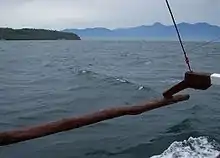 Imagem do golfo de Davao. Do lado esquerdo fica a ilha Talikud, e ao fundo as montanhas de Mindanao, a sul de Davao City.