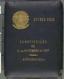 O novo governo foi chamado de Estado Novo, derivando seu nome do governo português chefiado por António de Oliveira Salazar e instalado apenas quatro anos antes, em 1933. A nova constituição corporativista também extraiu ideias das constituições da Itália e da Polônia, ganhando o apelido de "a polaca" pelos críticos em referência à constituição polaca contemporânea.[153][154] O texto deu amplos poderes a Getúlio, extinguiu os partidos políticos, aboliu a liberdade de imprensa e instituiu a censura prévia.[155] Segundo o historiador John W. F. Dulles, o texto da carta magna de 1937 "teria satisfeito o ditador mais ambicioso."[156] Também foi declarado estado de emergência, permitindo ao presidente suspender as imunidades parlamentares, prender e exilar cidadãos e invadir domicílios. Para afirmar a nova unidade nacional, as bandeiras dos estados foram queimadas em cerimônia pública.[155]