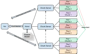 O servidor mestre geralmente não armazena os fragmentos reais, mas sim todos os metadados associados aos fragmentos, como as tabelas que mapeiam os rótulos de 64 bits para locais de fragmentos e os arquivos que eles compõem (mapeamento de arquivos para fragmentos), os locais das cópias dos fragmentos, quais processos estão lendo ou escrevendo em um determinado fragmento ou tirando uma "instantâneo" do fragmento para replicá-lo (geralmente por instigação do servidor mestre, quando, devido a falhas nos nós, o número de cópias de um fragmento caiu abaixo do número definido). Todos esses metadados são mantidos atualizados pelo servidor mestre periodicamente recebendo atualizações de cada servidor de fragmento ("Mensagens de batimento cardíaco"). As permissões para modificações são tratadas por um sistema de "locações" limitadas no tempo e expirantes, onde o servidor mestre concede permissão a um processo por um período finito durante o qual nenhum outro processo receberá permissão do servidor mestre para modificar o fragmento.[4]