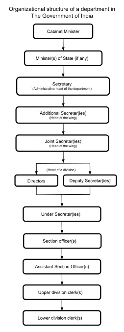 Uma secretária do Governo da Índia, um funcionário público, geralmente um oficial do Serviço Administrativo Indiano (IAS),[19][20][21][22] é o chefe administrativo do ministério ou departamento e é o principal consultor para o ministro em todos os assuntos de política e administração dentro do ministério/departamento.[23][24] Os secretários do governo da Índia ocupam o 23º lugar na ordem de precedência indiana.[25][26][27][28] Os secretários de nível superior são assistidos por um ou mais secretários adicionais, que são assistidos por secretários conjuntos.[24] No meio, eles são assistidos por diretores/vice-secretários e sob secretários.[24] No nível inferior, há oficiais de seção, assistentes de seção, funcionários da divisão superior, funcionários da divisão inferior e outros funcionários de secretariado.[24]