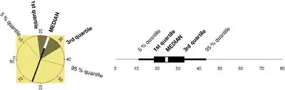 - Um leque (um segmento de um círculo) que indica o quartis