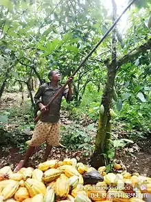 Os frutos não amadurecidos do cacau têm uma variedade de cores, mas na maioria das vezes são verdes, vermelhos ou roxos e, à medida que amadurecem, sua cor tende para o amarelo ou laranja, principalmente nos vincos.[10][19] Ao contrário da maioria das árvores frutíferas, a vagem do cacau cresce diretamente do tronco ou de grandes galhos de uma árvore, e não da ponta de um galho, semelhante à jaca. Isso torna a colheita manual mais fácil, pois a maioria dos frutos não fica nos galhos mais altos. Os frutos de uma árvore não amadurecem juntos; a colheita deve ser feita periodicamente ao longo do ano. A colheita ocorre entre três e quatro vezes por semana durante a época de colheita. Os frutos maduros e quase maduros, a julgar por sua cor, são colhidos do tronco e galhos do cacaueiro com uma faca curva em uma longa vara. Deve-se ter cuidado ao cortar o caule da vagem para evitar danificar a junção do caule com a árvore, pois é dali que surgirão as futuras flores e vagens.[20] Uma pessoa pode colher cerca de 650 frutos por dia.[18][21]