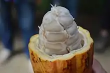 Uma vagem de cacau (fruta) tem cerca de 17 a 20 cm (6,7 a 7,9 polegadas) de comprimento e tem uma casca rigída semelhante a couro de cerca de 2 a 3 cm (0,79 a 1,18 polegadas) de espessura (varia de acordo com a origem e a variedade da vagem) preenchida com uma polpa doce e mucilaginosa (chamada de baba de cacau na América do Sul) com gosto de limonada que envolve entre 30 a 50 sementes grandes razoavelmente macias de coloração lavanda clara a uma cor púrpura acastanhada escura.