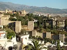 Granada cresceu de forma sustentada durante a segunda metade do século XIII, com o advento do Reino Nacérida, o que obrigou à ampliação das muralhas defensivas. Foi terminada a muralha do Nayd, iniciada ainda no período almóada, e construída a do grande bairro Rabad al-bayyazin, a norte da cidade, esta última terminada antes de 1327. Nessa época a cidade apresenta-se com uma estrutura tipicamente islâmica.[20] Tanto a almedina como os arrabaldes eram organizados em bairros, de tamanho e população muito diversa. Cada um desses bairros tinha um cádi, encarregado de manter a ordem, sobretudo nos mercados. Dispunham também de um sistema de vigilância noturna, ajustada estritamente ao perímetro do bairro, que tinha como missão vigiar e abrir as portas da muralha quando fosse necessário, tanto as interiores como as principais, para o exterior.[21]
