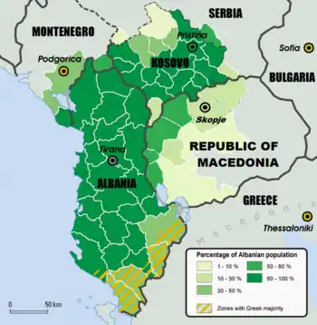 De acordo com o relatório Gallup Balkan Monitor de 2010, a ideia de uma Grande Albânia é apoiada pela maioria dos albaneses da Albânia (63%), Kosovo (81%) e da República da Macedónia (53%).[5][6]