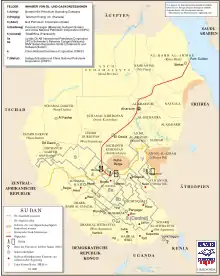 A rota tomada pelo Grande Oleoduto do Nilo é mostrada neste mapa da USAID de 2001. As fronteiras estatais mudaram desde 2001