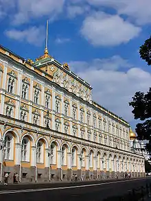 O edifício central construído entre 1838 e 1849 trouxe um papel representativo a todos os edifícios do complexo. Vista de fora, a estrutura parece relativamente simples: a fachada principal, que se estende ao longo da margem do Moscova, possui uma cúpula a coroar a sua parte central, na qual está instalado um relógio com quatro mostradres dourados. A cúpula é encimada por uma haste, onde, desde a década de 1990, adeja a Bandeira Nacional da Rússia (antes: a Bandeira da União Soviética). Na fachada do edifício do palácio, com dois pisos mas três filas de janelas sobrepostas, a sua parte inferior é ligeiramente mais alta e está alguns metros saliente em relação às duas que se lhe sobrepõem, de forma a cobrir uma galeria aberta ao longo de toda a fachada. Globalmente, a fachada principal do edifício resulta bastante monótona, parecendo mais um edifício de escritórios típico do Império Russo do século XIX que uma fachada esculpida para uma sede do czar – esta característica, em particular, deixou Konstantin Thon exposto ao fogo cruzado das críticas.