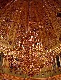 Na abóbada deste salão, à semelhança dos outros salões de festas do piso superior, pendem candelabros de bronze dourado, cuja luz é acrescentada por seis lampadários em cristal de chumbo, produzidos em São Petersburgo. Uma das principais atracções do Salão de Santa Catarina é a sua abóbada suportada por pilones, os quais são embelezados com padrões de mosaico em malaquita verde escuro.